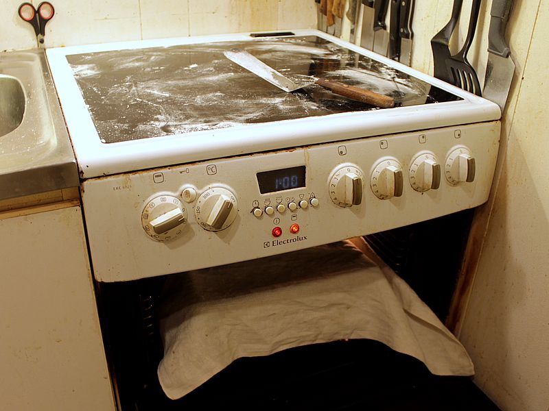 Hollenderen er snudd på hodet, og innholdet landet i et bed av hvetemel. Heretter knas og eltes deigen til den er klebrig, men ikke klissete, og minst mulig ligger igjen på "bakefjøla", som rett og slett er komfyrtoppen. Det er verdens beste sted for utbaking; bare husk å slå av alle plater, humre ...