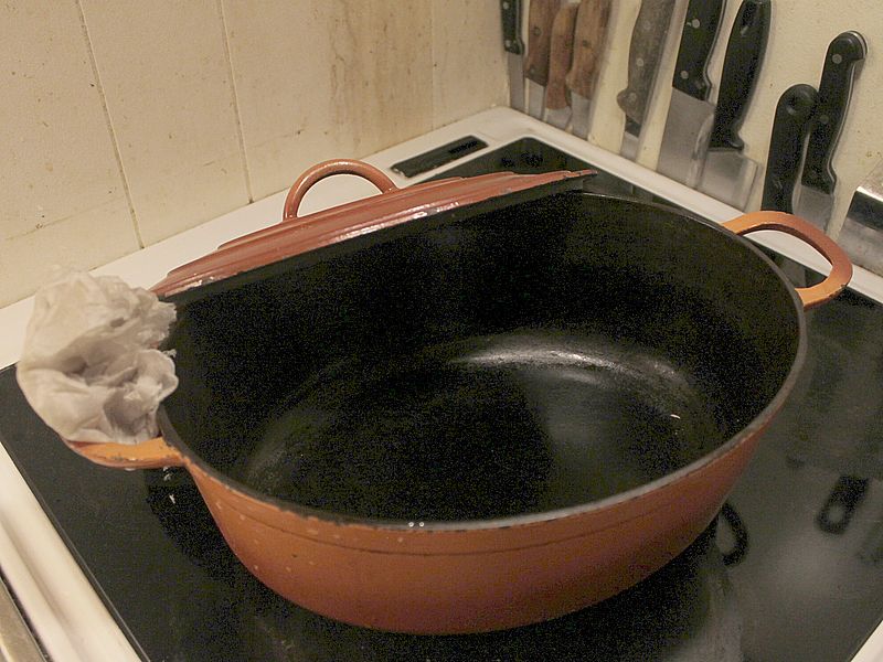 Jeg må først få lov til å skryte av min "Cajun Classic Deutch Oval", som de kalles i dag, laget av Le Creuset i lett modifiserte utgaver - lokkene har fått varmeisolerte knotter i stedet for støpt handtak. Det kan være Le Creuset som i sin tid laget denne også; jeg kjenner ikke konsernets historie, og eneste identifikasjon er at det på lokket er innstøpt "HOLLAND 16". Jeg tenkte aldri på å spørre hvor den kom fra før det var for sent. Jeg har en mistanke om at det er en bryllupsgave, og da snakker vi andre verdenskrig ... heller ikke umulig den første, for den kan stamme tilbake til min mors opphav i Sverige.