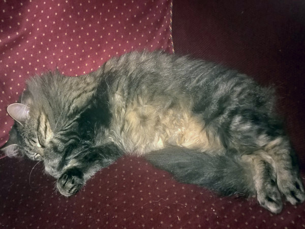 Jo, man rydder plass i hus og hjerte. Dette er en vaskeekte skogkatt, anslagsvis av årgang tidlig 2014, og fix ferdig sterilisert viste det seg: ved veterinærbesøk med dette som formål, kunne Marit Knive fastslå at sting satt igjen etter operasjonen, sannsynligvis foretatt under et halvt år i forveien. Hvorav jeg slutter at kattens tidligere eier enten har gått brått ut av tiden, eller blitt innlagt på hjem, og ikke har hatt noen som har brydd seg om dyret.