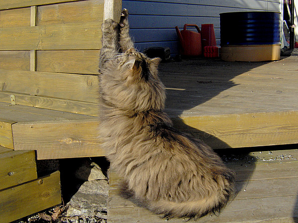 Jeg har vært litt fortvilet de siste par dagene. Tufsen har hengt opp noe greier på stigen min, "fiskegarn"kaller han det, slik at jeg ikke kommer opp på taket. Stoler ikke på det der, selv om det er luftig og lukter godt. Må detta henge akkurat der, da?