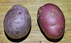 Disse to potetene lå i samme kasse for løsvekt i min nærbutikk. Kassa var ikke merket annet enn "Norsk Potet", men man må anta at de var av samme sort og samme avling. Det var omtrent like mange klart burgunder som klart gråbrune. De gråbrune var faktisk fristende, fordi de minnet om gode, gamle Kerrs Pink.