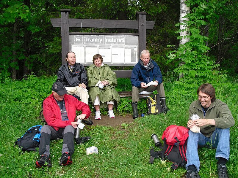 Vi måtte jo ta turen innom Tranby Natursti, selv om denne ble grundig gjennomgått ved fjorårets botaniske vandring. I fjor var vi noen uker senere ute, og misset et par arter. Stien er altså vedlikeholdt av NiLs assosierte Tore Wiik og Irene Vedå, som *selvfølgelig* var med også i år. De serverte forresten en omvendt premie i konkurransen på Høgda: alle fikk smake en medbrakt gulrotkake (gulrot er skjermplante) med anisglasur (anis er også en skjermplante; lakris en erteblomst) ... eller hva det nå var; oppskrift etterlyses.